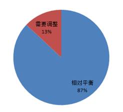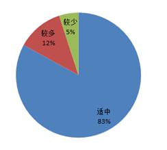 由上图可见其中83%的学生认为本专业的总学时适中,12%的学生认为本专业的总学时较多,5%的学生认为总学时较少;而87%的学生认为各学期的课程安排相对平衡,13%的学生认为各学期课程安排需要调整。对于造成课程安排不协调的调查问题中,学生认为学业任务较重的学期主要集中在大二下和大三上学期;其他一些问题中,例如在专业课衔接方面,86%的学生认为本专业的专业课衔接合理,14%的学生认为不合理,主要问题包括:有些课程的内容有重复;有些专业课和基础课的顺序安排不合理;某些专业课课时少导致不能深入理解等。