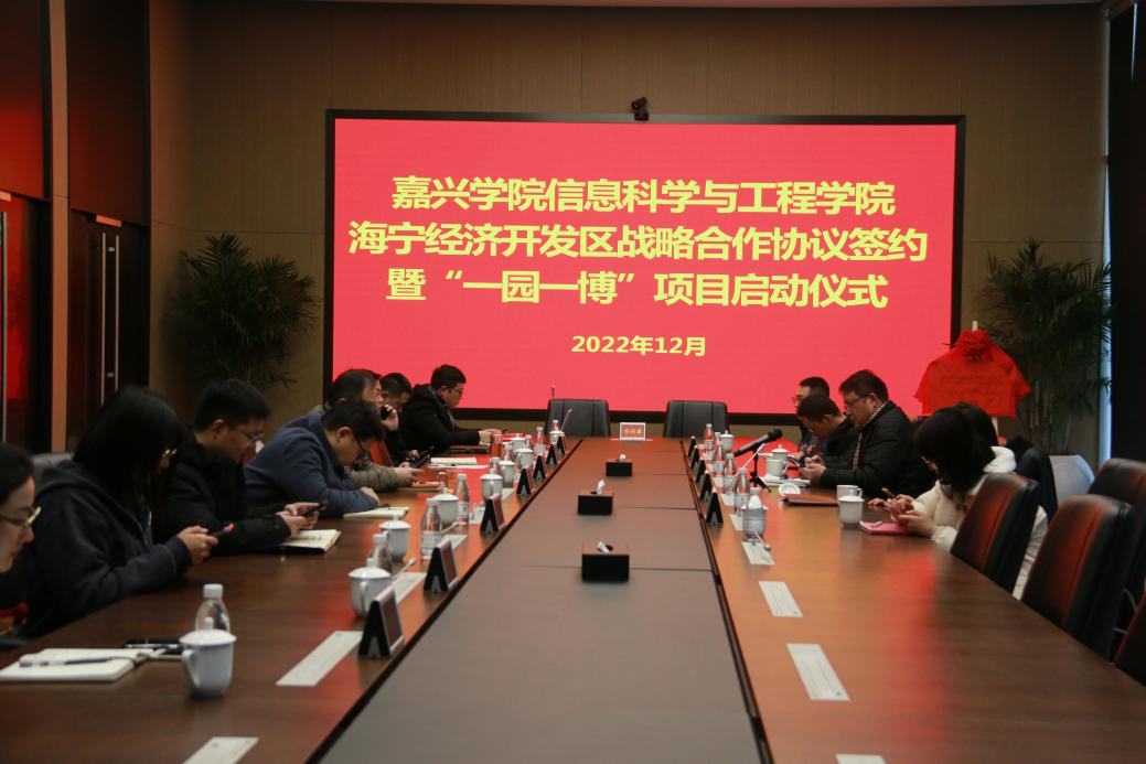 12月2日,学院“一园一博”服务工作站启动及战略合作签约仪式在海宁经济开发区管委会举行。海宁经济开发区党工委副书记、海宁经济开发区管理委员会主任李振、海昌街道党委委员顾煜峰、学院院长朱耀东、党委书记谢宏、学院博士教师代表及企业、平台代表出席活动。