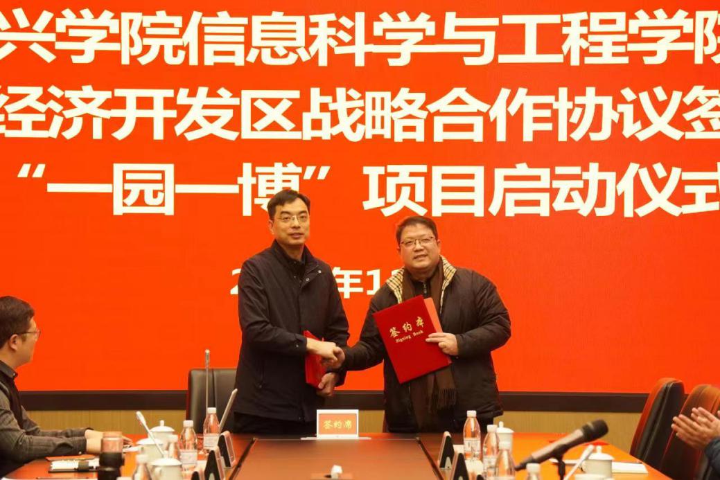 朱耀东代表学院与海宁经济技术开发区签署战略合作协议,并就学院与地方联合建立“一园一博”服务工作站的背景、目标、主要做法、已取得成绩及学院科研、人才情况进行详细介绍。